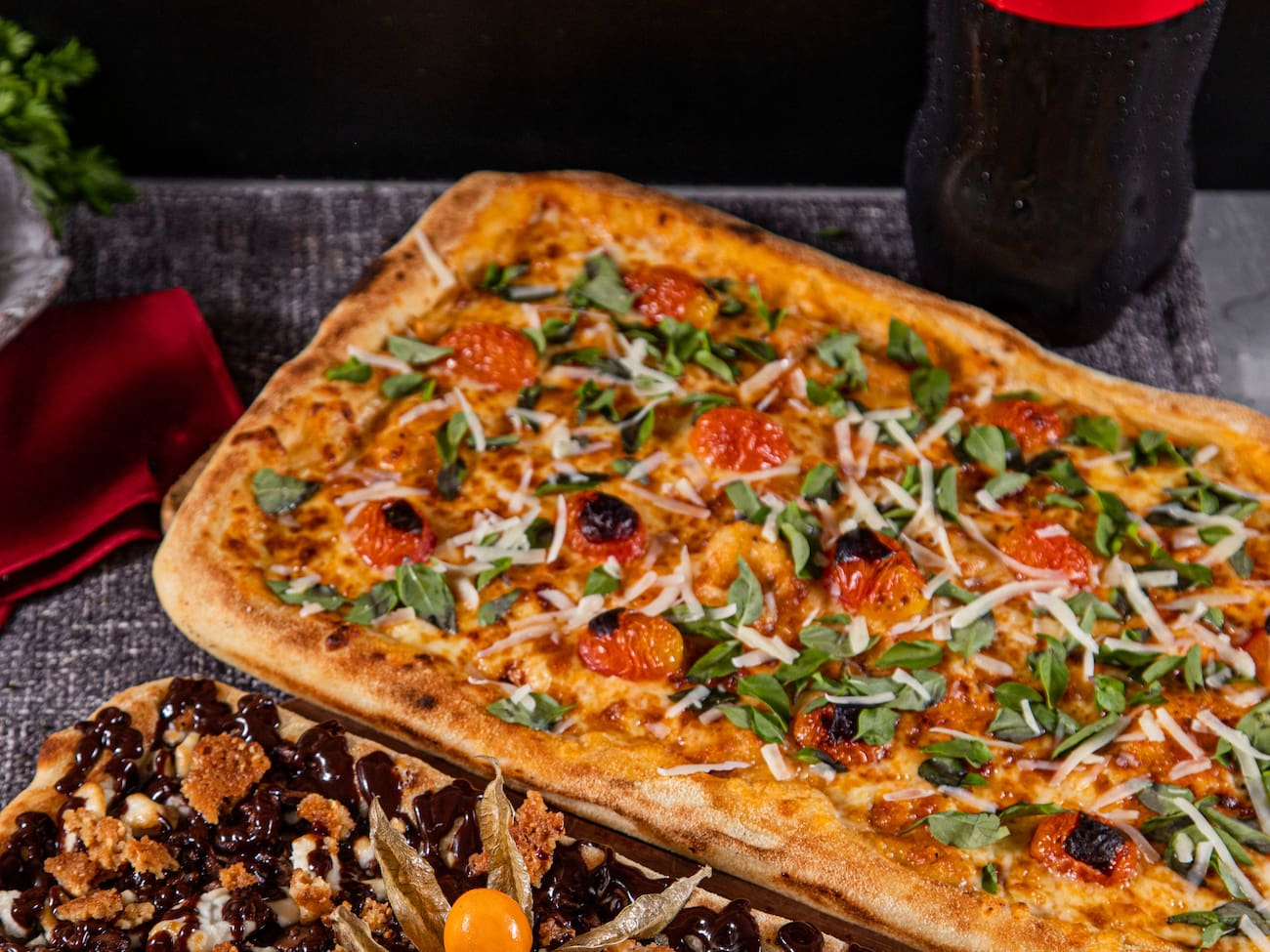 O combo inclui 1 pizza salgada Grande + 1 pizza doce Pequena + Refrigerante.
